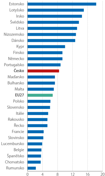 Při mezinárodním srovnání Česko v roce 2024 vykázalo míru zaměstnanosti osob nad 65 let ve výši 8,4 %, tedy nad průměrem EU. Nejvyšší podíly mají pobaltské země (18,3 % v Estonsku, 15 % v Lotyšsku), ale také severské země, Irsko, Nizozemsko, Kypr a Portugalsko. Viz graf níže.