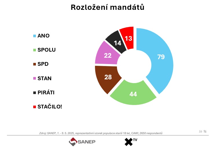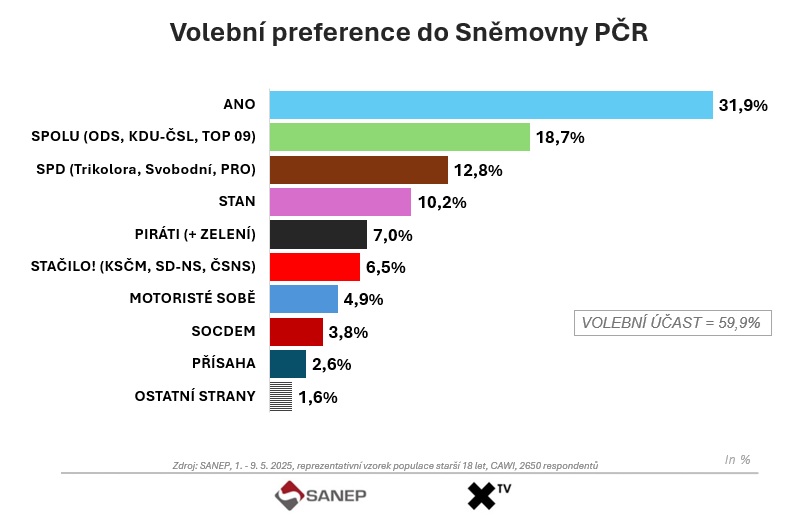 Podle nejnovějšího exkluzivního průzkumu společnosti SANEP pro XTV, který proběhl ve dnech 1. až 9. května 2025 na reprezentativním vzorku 2 650 respondentů starších 18 let metodou CAWI, by volby do Poslanecké sněmovny Parlamentu České republiky s přehledem vyhrála strana ANO. Hnutí vedené Andrejem Babišem získalo 31,9 % hlasů.
