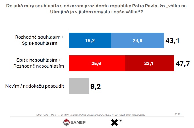Nový průzkum agentury SANEP ukazuje hluboké rozdělení české společnosti. Více lidí odmítá tvrzení prezidenta Pavla, že válka na Ukrajině je také válkou České republiky.