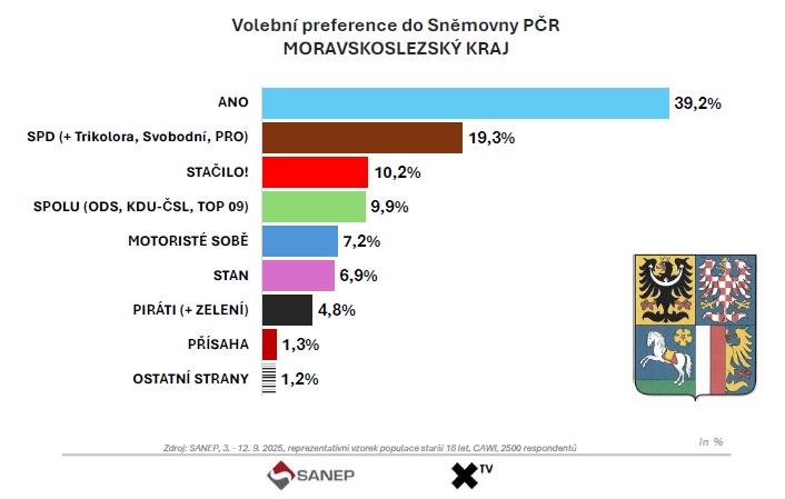 Exkluzivní průzkum agentury SANEP pro XTV ve volebním speciálu VOLBY 2025 ukazuje, že politická mapa Moravskoslezského kraje se před volbami 2025 zásadně proměňuje. Hnutí ANO zde dál posiluje a s 39,2 procenty by dnes s přehledem vyhrálo. Zatímco v roce 2021 získalo 33,73 procenta a obsadilo deset mandátů, nyní by si polepšilo o více než pět procentních bodů. Andrej Babiš tak v regionu upevňuje tradičně silnou voličskou základnu a zároveň přitahuje část zklamaných voličů oslabených stran.