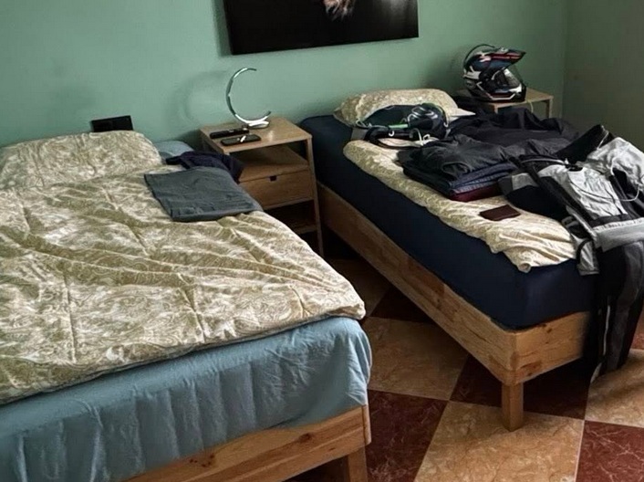 Na fotografii je interiér se dvěma jednolůžky, nočním stolkem uprostřed, zelenou stěnou, velkým obrazem lva nad pravou postelí a dlažbou ve čtvercích. Levá postel působí jako běžný dřevěný rám s viditelným čelem a čtyřmi nohami, který dává konstrukčně smysl. Pravá postel má podobný typ rámu, ale její spodní konstrukce a napojení bočnic vykazuje řadu nesrovnalostí, které jsou klíčové. Nejvýraznější je oblast čela a přední části rámu, kde spodní nosná část není souvislá. Zatímco levá postel vytváří uzavřený obdélník s jasně čitelnými spoji, u pravé postele se přední nosník jeví jako přerušený, místy mizí nebo plynule přechází do podoby, která neodpovídá žádnému standardnímu spoji. V prostoru přitom není žádný objekt, který by konstrukci realisticky zakrýval, což vytváří dojem, že část rámu byla pouze dopočítána podle očekávaného tvaru postele, nikoli vytvořena podle skutečné konstrukční logiky. V reálném prostředí jsou nosníky, spoje i stíny jasně čitelné, zatímco zde se hranice mezi dřevem, stínem a prázdným prostorem místy rozplývá.