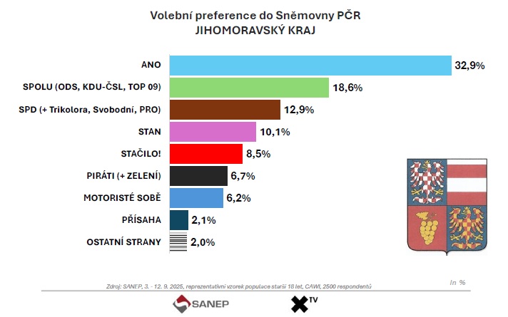 Exkluzivní zářijový průzkum agentury SANEP pro XTV ukazuje, že politická mapa Jihomoravského kraje se čtyři roky po posledních sněmovních volbách zásadně proměnila. V regionu premiéra Petra Fialy dnes jasně vede hnutí ANO, které by se ziskem 32,9 procenta obsadilo první příčku. V roce 2021 přitom v kraji skončilo až druhé.