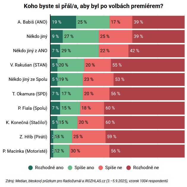 Českou politickou scénou hýbe nejnovější průzkum agentury Median, provedený ve dnech 3.–5. září 2025 pro ČRo a iRozhlas.cz. Šetření mezi více než tisícovkou respondentů ukázalo výrazný náskok předsedy hnutí ANO Andreje Babiše, kterého by si v čele vlády přálo 44 procent dotázaných občanů. Tento výsledek potvrzuje jeho dlouhodobě silnou pozici, přestože již několik let není součástí exekutivy.