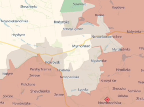 Podle mapy Deep State se „šedá zóna“ kolem Pokrovska a Mirnogradu výrazně rozšířila. Mimo jiné severně od Pokrovska k dálnici z Grišina, kterou jsou dopravovány zásoby ukrajinské posádce ve městě.