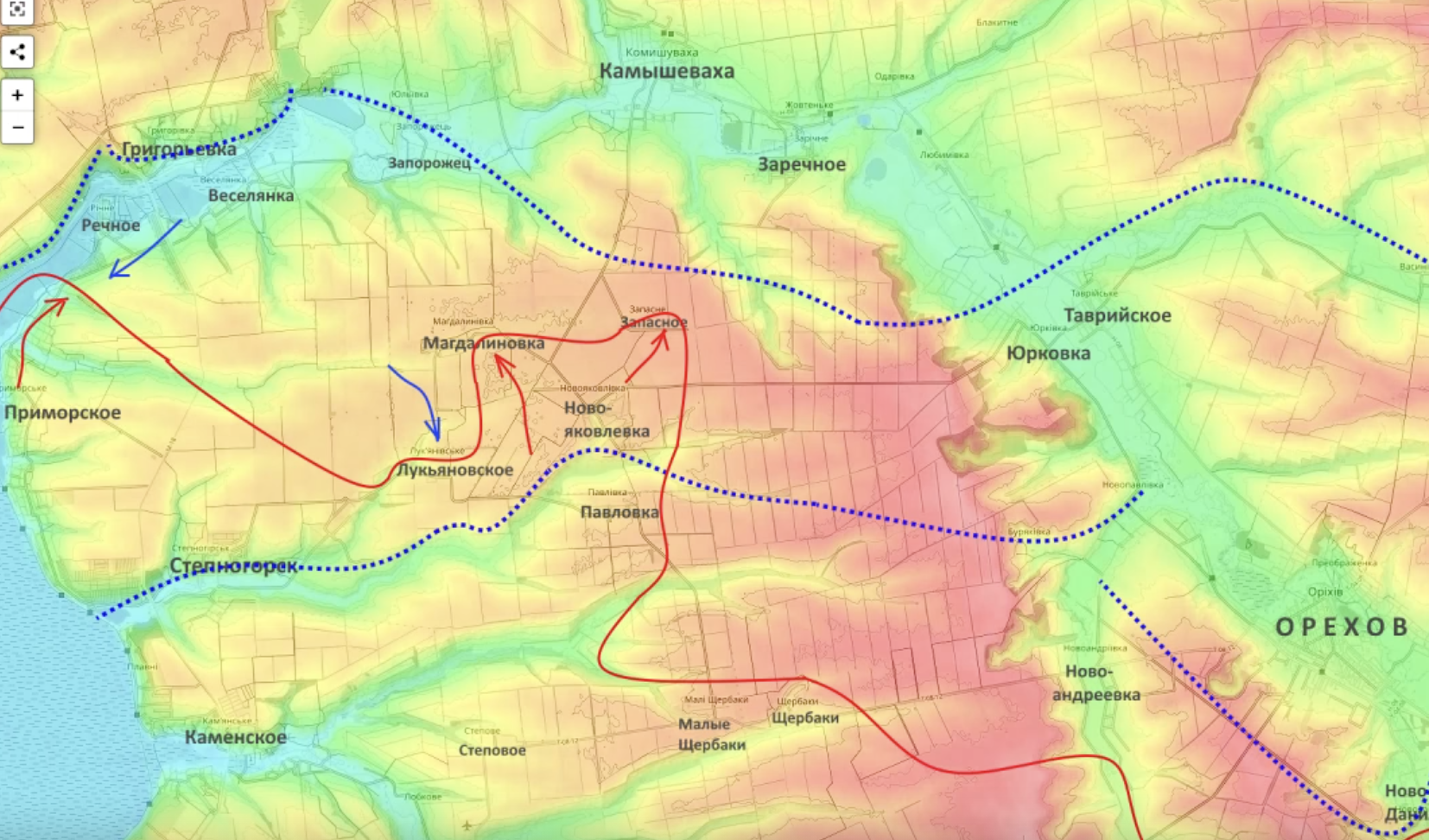V Záporoží údajně probíhají boje o vesnice Magdalinovka a Zapasnoje; Rusové chtějí dále zaútočit na Kamyševachu a Jurkovku.