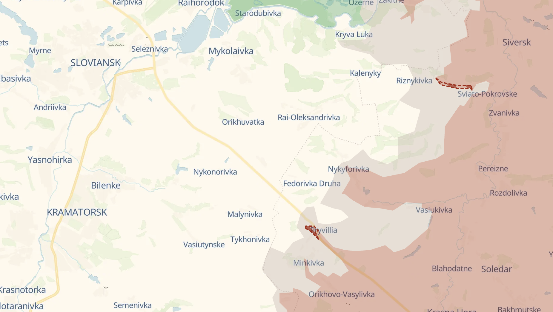 Podle vojenské veřejné skupiny Deep State postupovali podél dálnice Bachmut-Slavjansk poblíž Privolje a Golubovky. Na severu Rusko postupuje poblíž Reznikovky.
