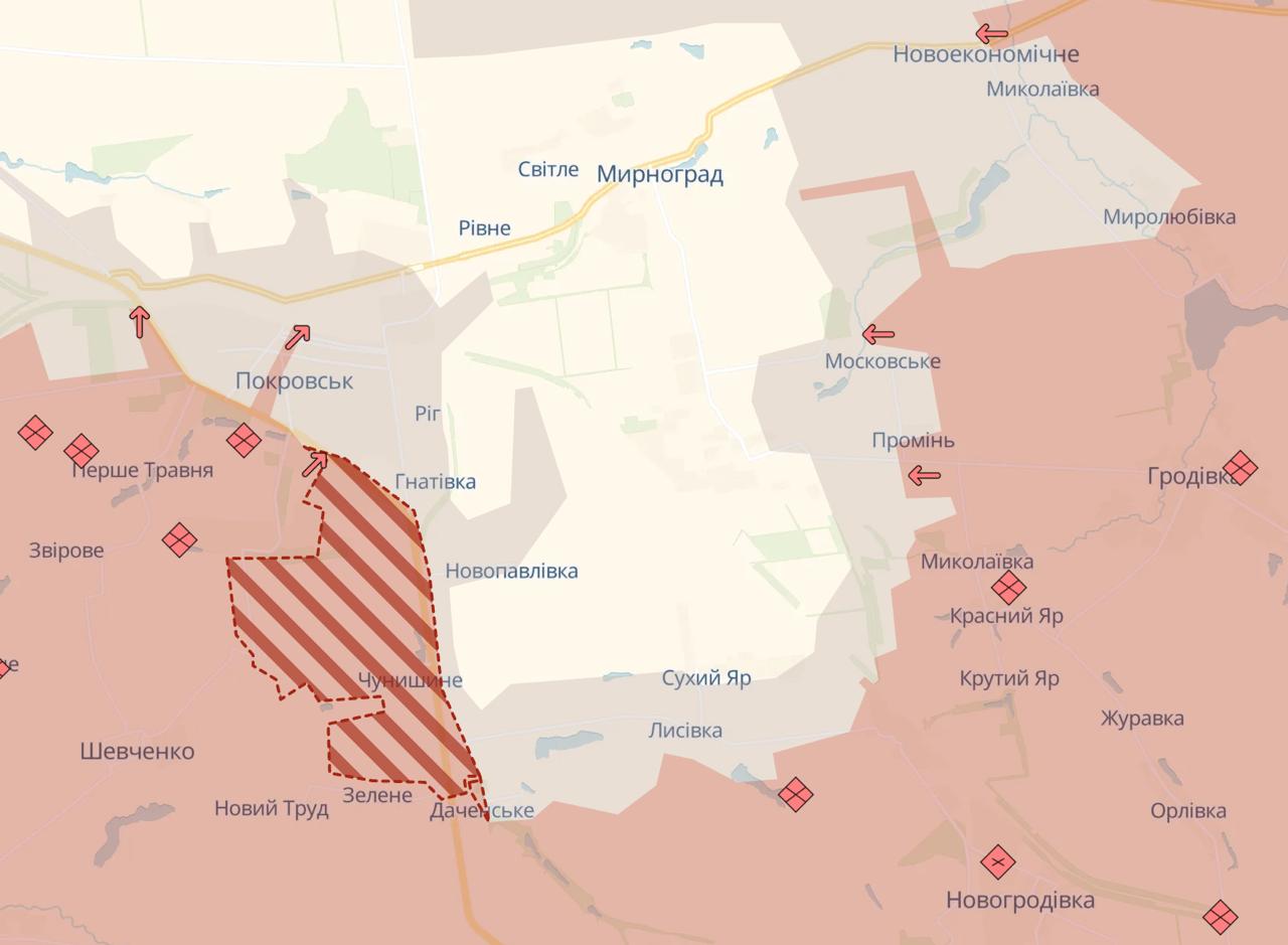 Rusové také postoupili poblíž Pokrovska a rozsáhle opevnili své pozice jižně od města. Ukrajinští vojenští představitelé dříve informovali, že ruské jednotky vstupují do města především přes jižní čtvrti.